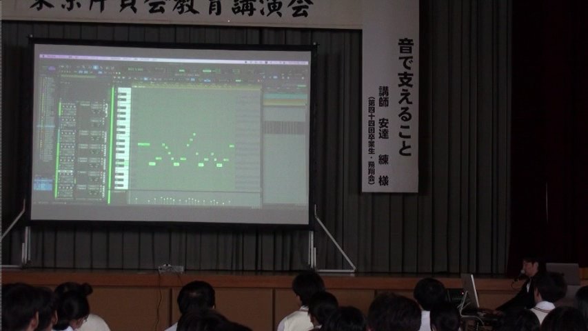 講演会の後半では片貝小学校の校歌を題材にして編曲の仕事を実演されました。